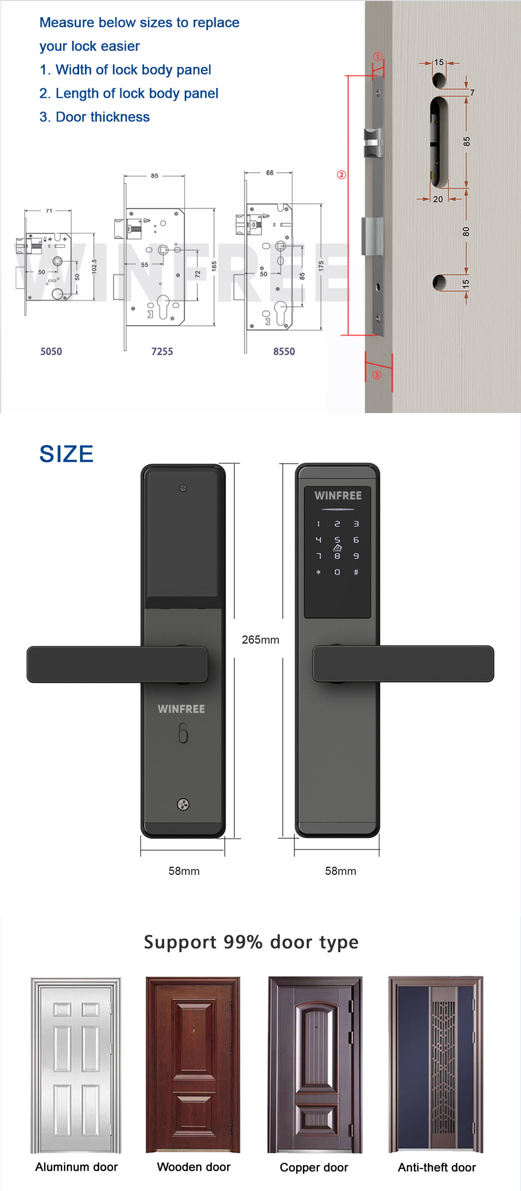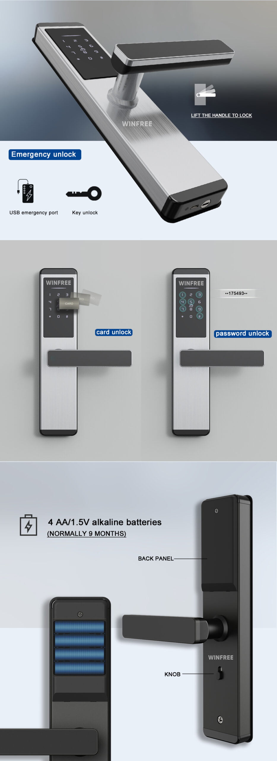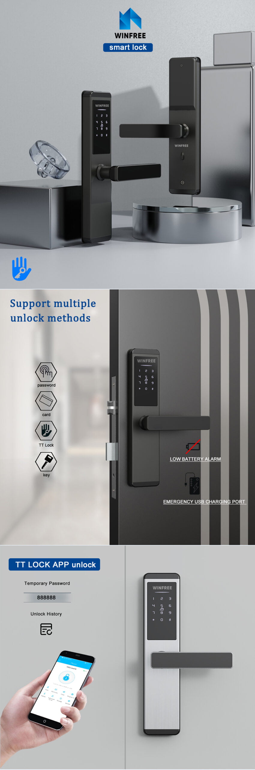 Unlock way: RFID card, passcode, App (TT lock ), key
